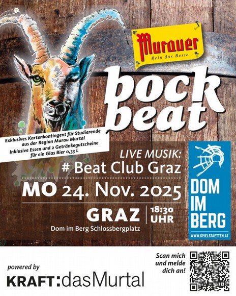 Psst! Schon gewusst? Am 24. November 2025 (ab 18.30 Uhr) veranstaltet die Brauerei Murau in Kooperation mit KRAFT:dasMurtal wieder ihren Bockbeat. Was ist das? Ein kunstvoll in Szene gesetzter Bockbieranstich, der auf der Brauerei mit kreativen Inszenierungen abseits des klassischen Fassanstichs überrascht. Das Spektakel findet heuer bereits zum sechsten Mal im Grazer Dom im Berg im Herzen des Schlossbergs statt.