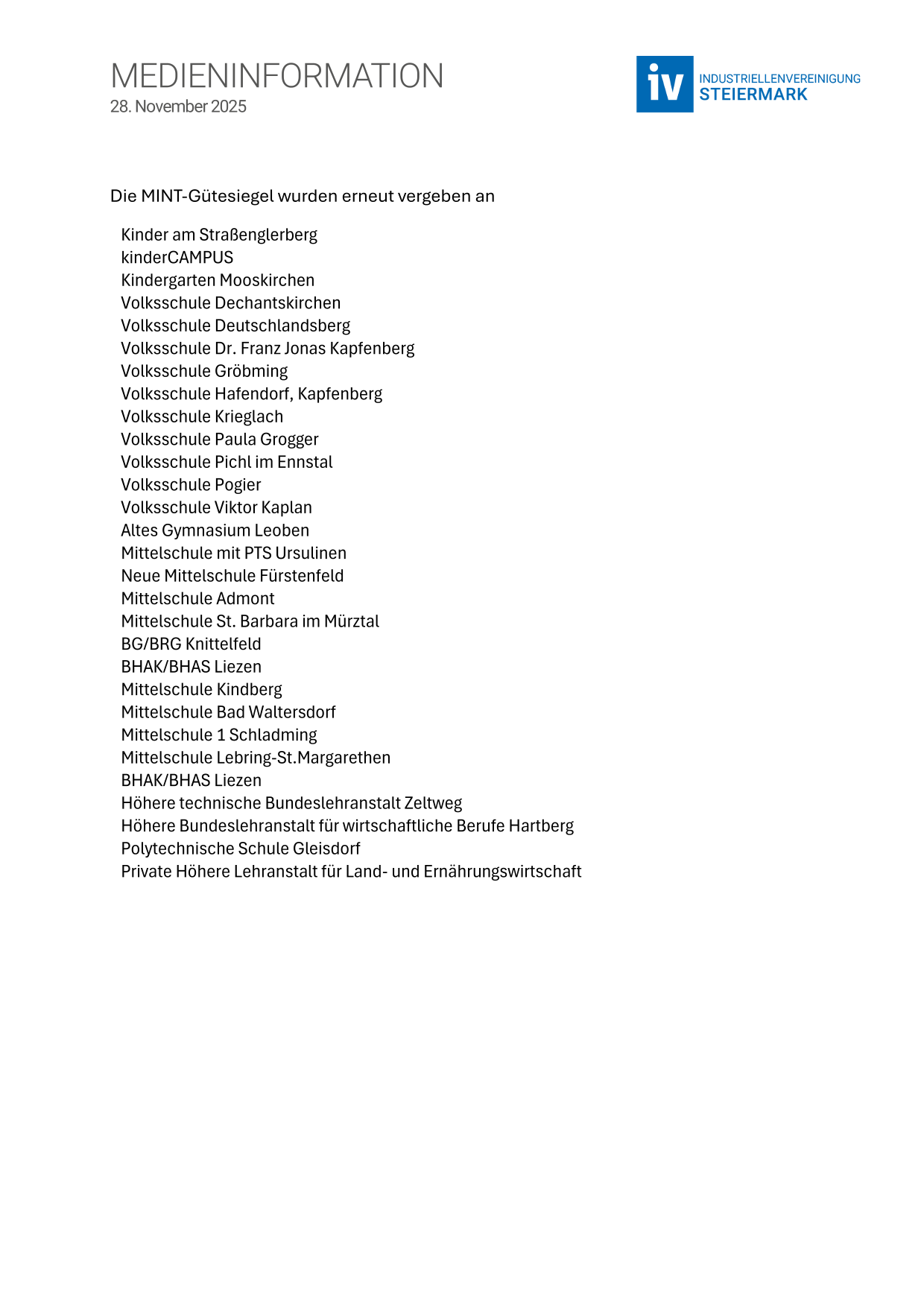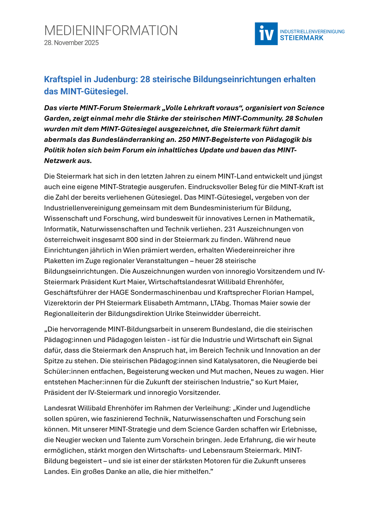 Die Steiermark hat sich in den letzten Jahren zu einem MINT-Land entwickelt und jüngst auch eine eigene MINT-Strategie ausgerufen. Eindrucksvoller Beleg für die MINT-Kraft ist die Zahl der bereits verliehenen Gütesiegel. Das MINT-Gütesiegel, vergeben von der Industriellenvereinigung gemeinsam mit dem Bundesministerium für Bildung, Wissenschaft und Forschung, wird bundesweit für innovatives Lernen in Mathematik, Informatik, Naturwissenschaften und Technik verliehen. 231 Auszeichnungen von österreichweit insgesamt 800 sind in der Steiermark zu finden. Während neue Einrichtungen jährlich in Wien prämiert werden, erhalten Wiedereinreicher ihre Plaketten im Zuge regionaler Veranstaltungen – heuer 28 steirische Bildungseinrichtungen. Die Auszeichnungen wurden von innoregio Vorsitzendem und IV-Steiermark Präsident Kurt Maier, Wirtschaftslandesrat Willibald Ehrenhöfer, Geschäftsführer der HAGE Sondermaschinenbau und Kraftsprecher Florian Hampel, Vizerektorin der PH Steiermark Elisabeth Amtmann, LTAbg. Thomas Maier sowie der Regionalleiterin der Bildungsdirektion Ulrike Steinwidder überreicht.
