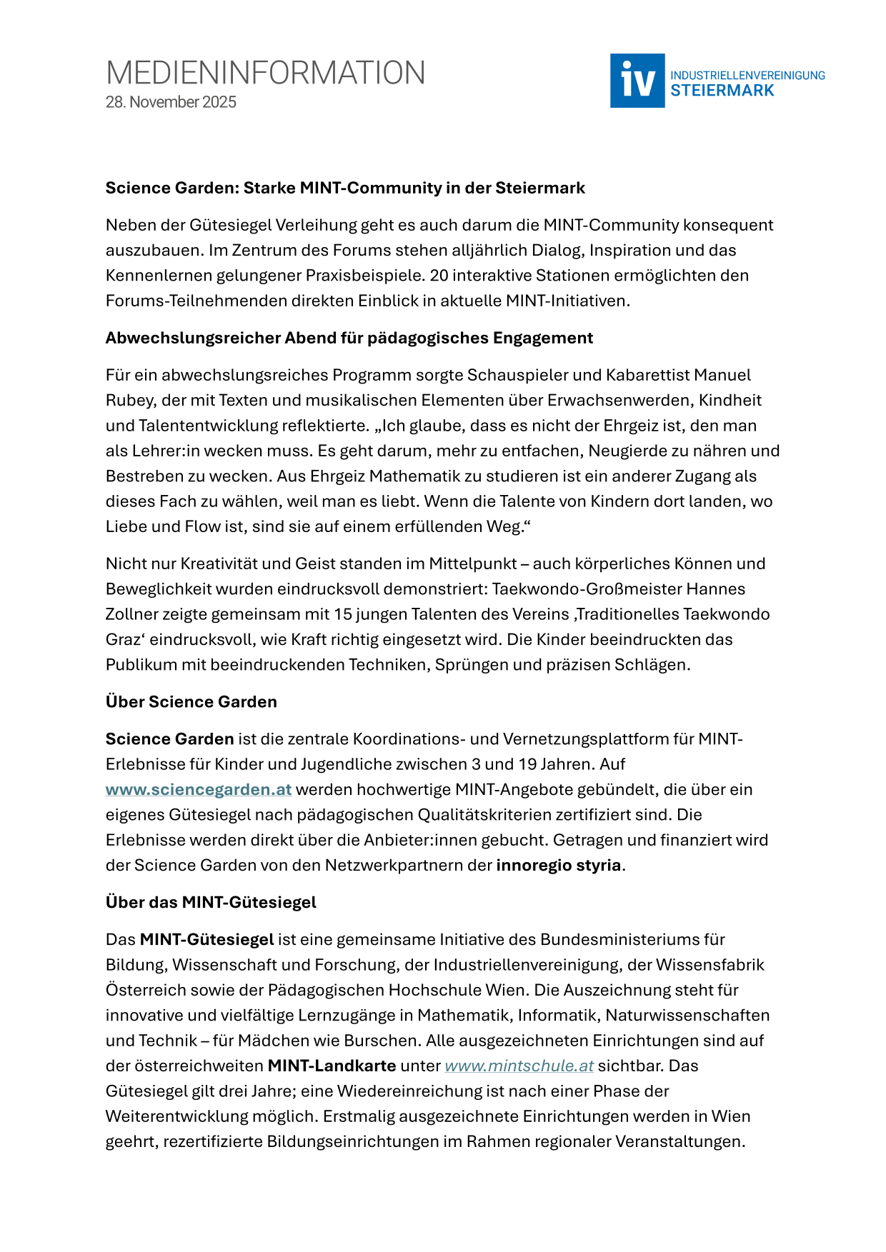 Landesrat Willibald Ehrenhöfer im Rahmen der Verleihung: „Kinder und Jugendliche sollen spüren, wie faszinierend Technik, Naturwissenschaften und Forschung sein können. Mit unserer MINT-Strategie und dem Science Garden schaffen wir Erlebnisse, die Neugier wecken und Talente zum Vorschein bringen. Jede Erfahrung, die wir heute ermöglichen, stärkt morgen den Wirtschafts- und Lebensraum Steiermark. MINT-Bildung begeistert – und sie ist einer der stärksten Motoren für die Zukunft unseres Landes. Ein großes Danke an alle, die hier mithelfen.”