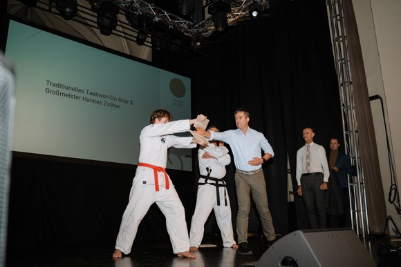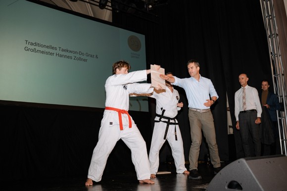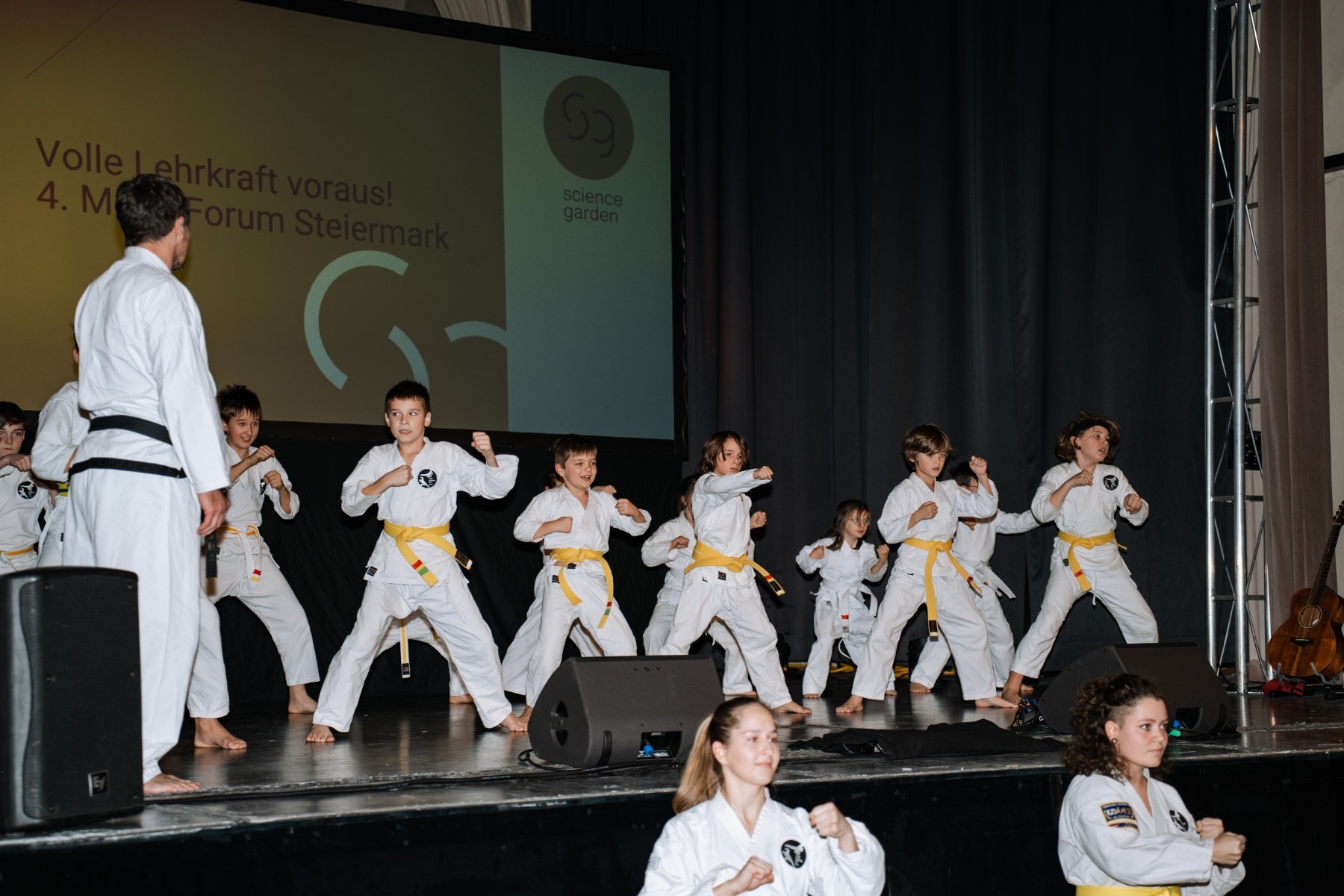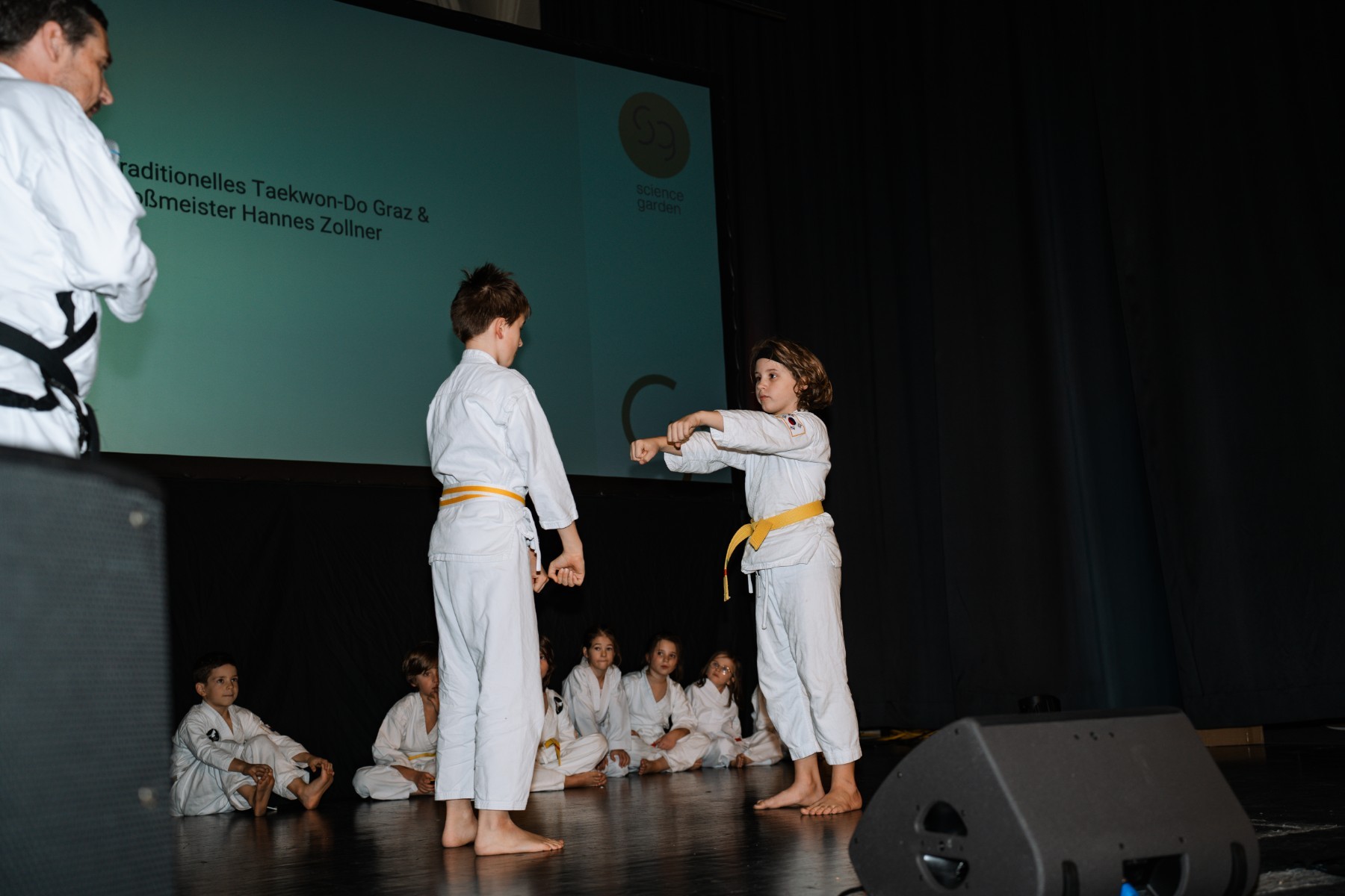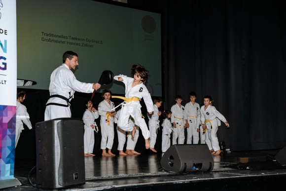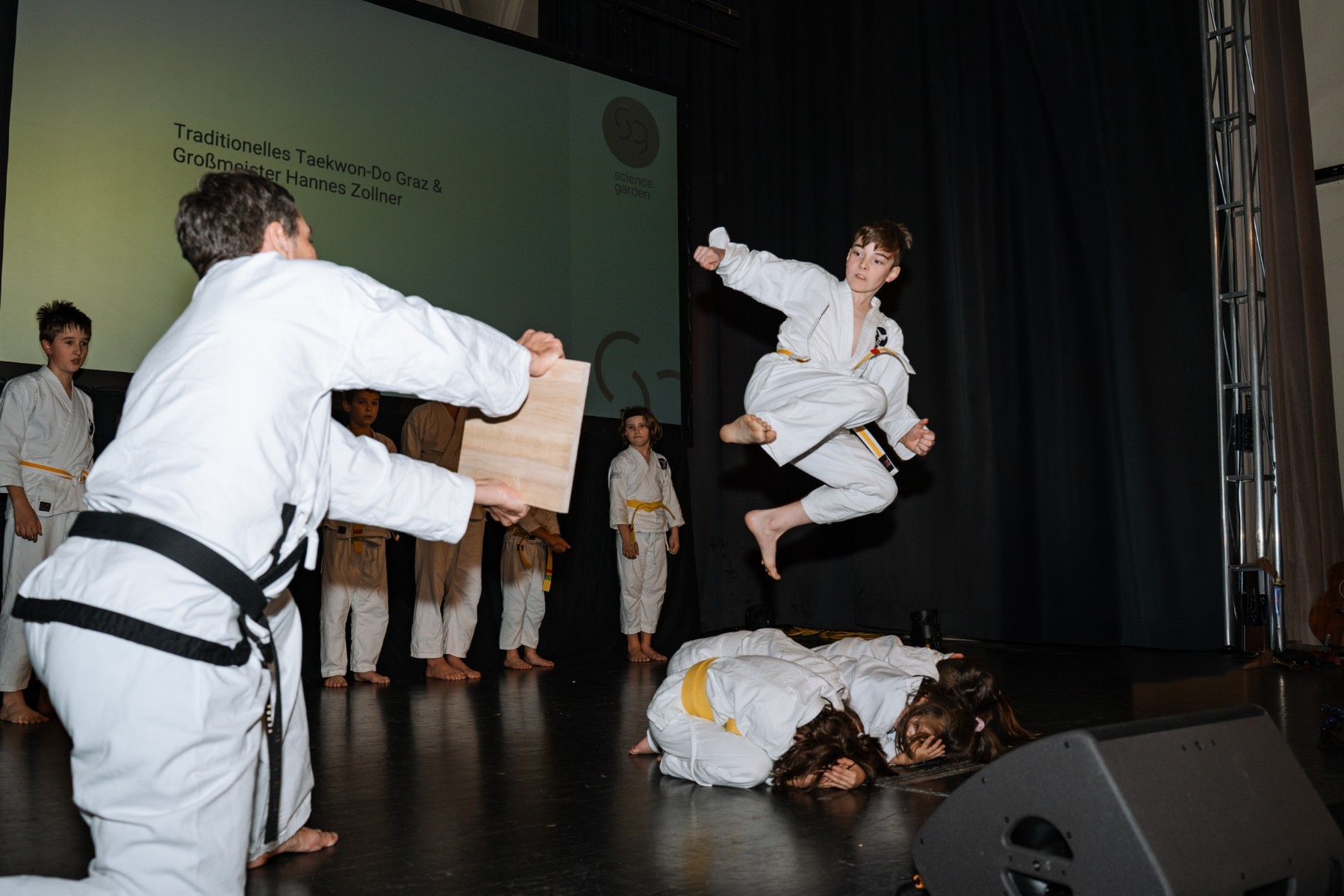 Nicht nur Kreativität und Geist standen im Mittelpunkt – auch körperliches Können und Beweglichkeit wurden eindrucksvoll demonstriert: Taekwondo-Großmeister Hannes Zollner zeigte gemeinsam mit 15 jungen Talenten des Vereins ‚Traditionelles Taekwondo Graz‘ eindrucksvoll, wie Kraft richtig eingesetzt wird. Die Kinder beeindruckten das Publikum mit beeindruckenden Techniken, Sprüngen und präzisen Schlägen.