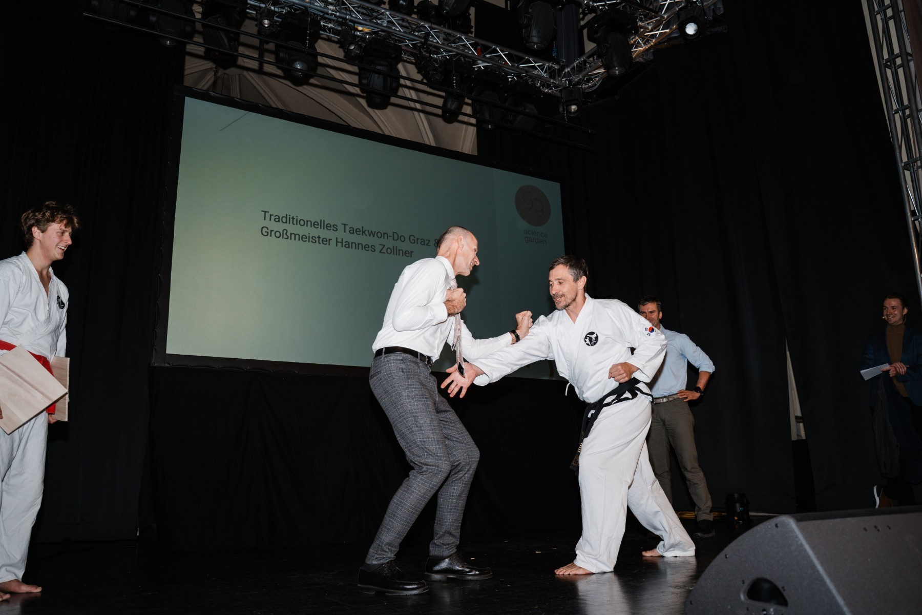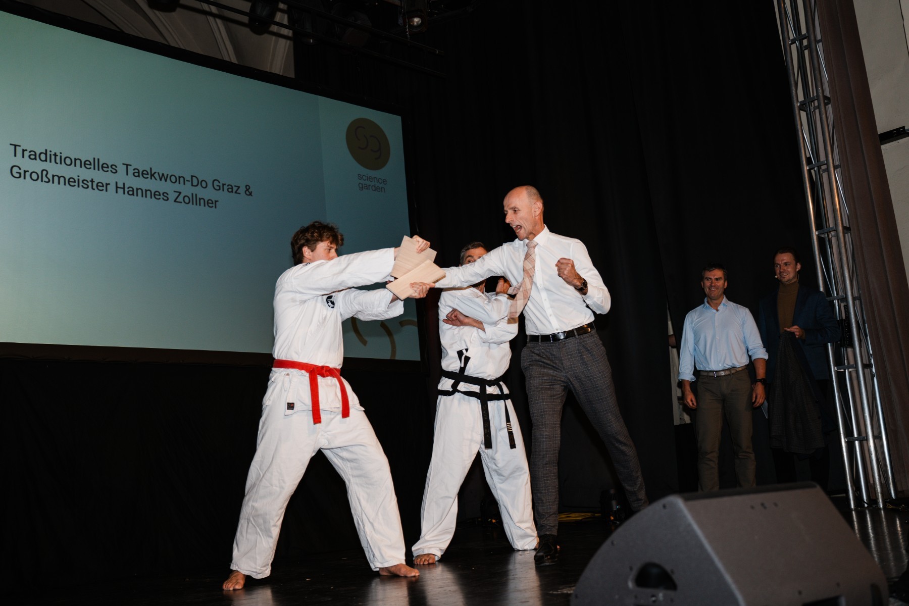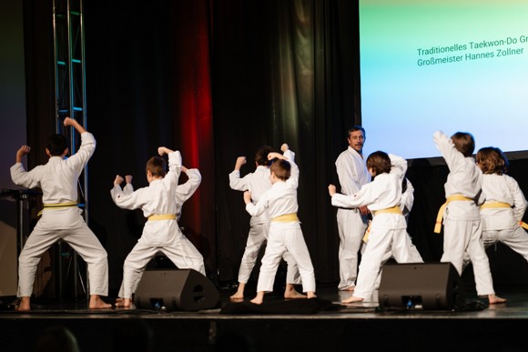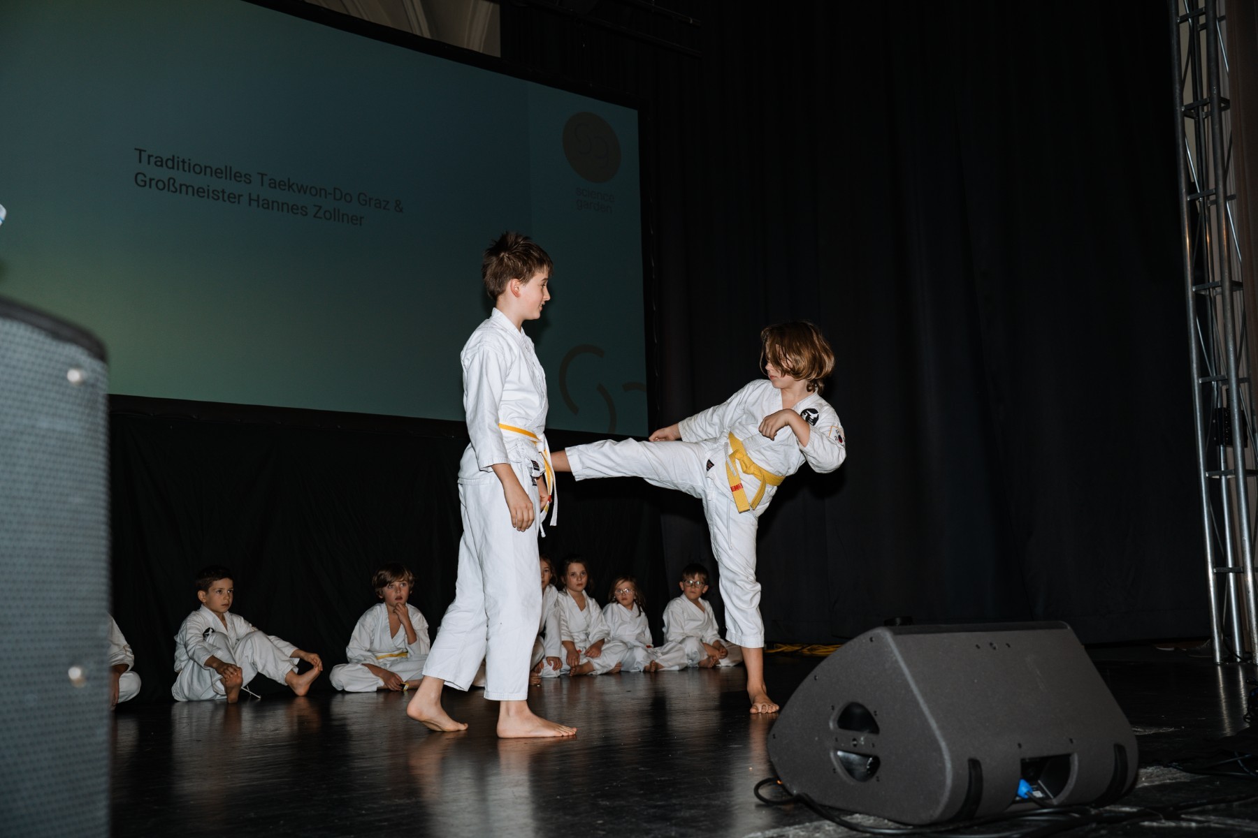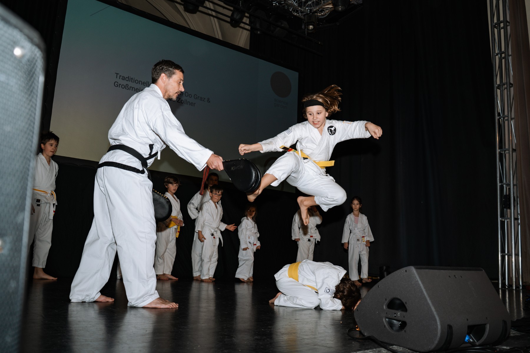 Nicht nur Kreativität und Geist standen im Mittelpunkt – auch körperliches Können und Beweglichkeit wurden eindrucksvoll demonstriert: Taekwondo-Großmeister Hannes Zollner zeigte gemeinsam mit 15 jungen Talenten des Vereins ‚Traditionelles Taekwondo Graz‘ eindrucksvoll, wie Kraft richtig eingesetzt wird. Die Kinder beeindruckten das Publikum mit beeindruckenden Techniken, Sprüngen und präzisen Schlägen.
