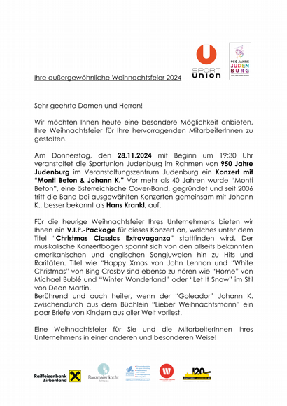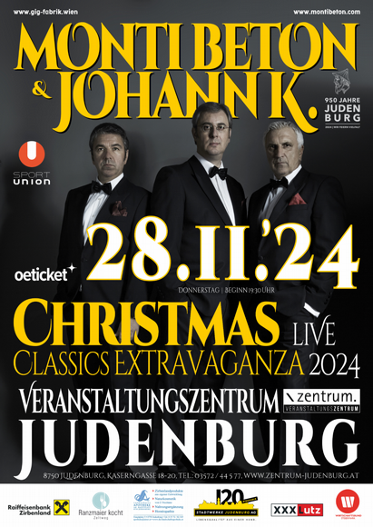 Am Donnerstag, den 28.11.2024 mit Beginn um 19:30 Uhr veranstaltet die Sportunion Judenburg im Rahmen von 950 Jahre Judenburg im Veranstaltungszentrum Judenburg ein Konzert mit “Monti Beton & Johann K.” Vor mehr als 40 Jahren wurde “Monti Beton”, eine österreichische Cover-Band, gegründet und seit 2006 tritt die Band bei ausgewählten Konzerten gemeinsam mit Johann K., besser bekannt als Hans Krankl, auf.