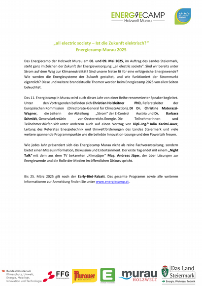 Bis 25. März 2025 gilt noch der Early-Bird-Rabatt. Das gesamte Programm sowie alle weiteren Informationen zur Anmeldung finden Sie unter www.energiecamp.at.