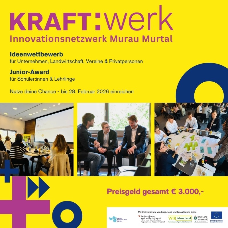 Wir freuen uns sehr, den KRAFT:werk Ideenwettbewerb in Kooperation mit dem Social Business Hub Styria vorzustellen: