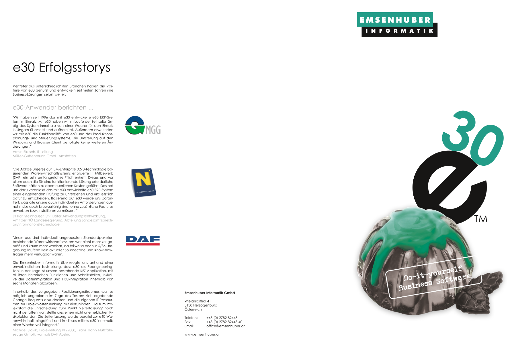 Durch E30-KI erlernt der Computer das Programmieren und versetzt Benutzer ohne IT-Know-how in die Lage Applikationen zu warten, zu erweitern und wir garantieren die Funktionalität. Höchstmögliche Verfügbarkeit und Sicherheit prägt unseren Qualitätsanspruch einhergehend mit einem ausgezeichneten Preis- Leistungsverhältnis.